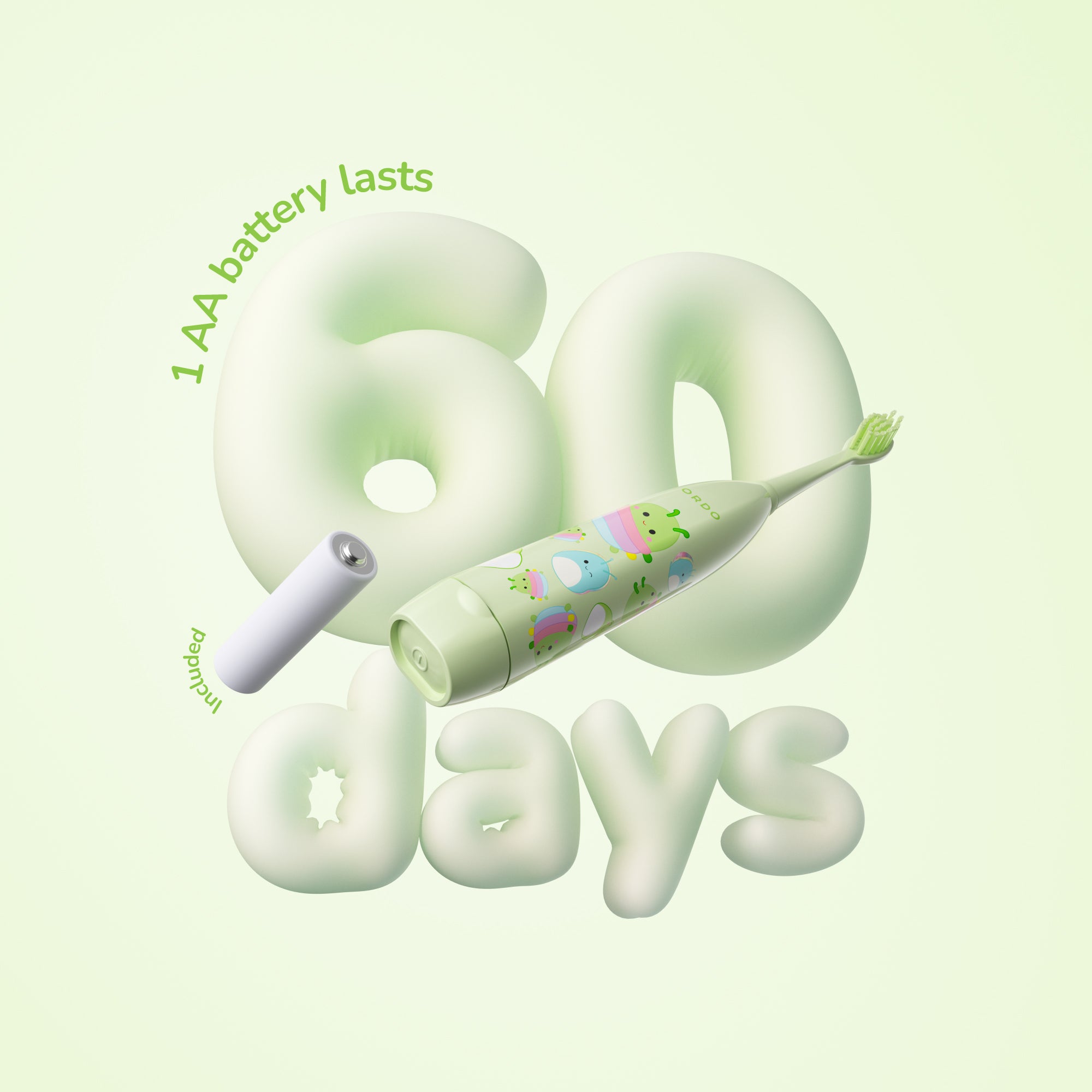 The toothbrush can last up to 60 days on a single AA battery, ensuring long-lasting use without frequent recharging.